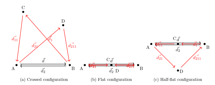 The quadrilaterals shown in Figures (a), (b), and (c) are, respectively, crossed, flat, and "half-flat". These configurations are also distinguished by the orientation of their internal angles and the cross products.
